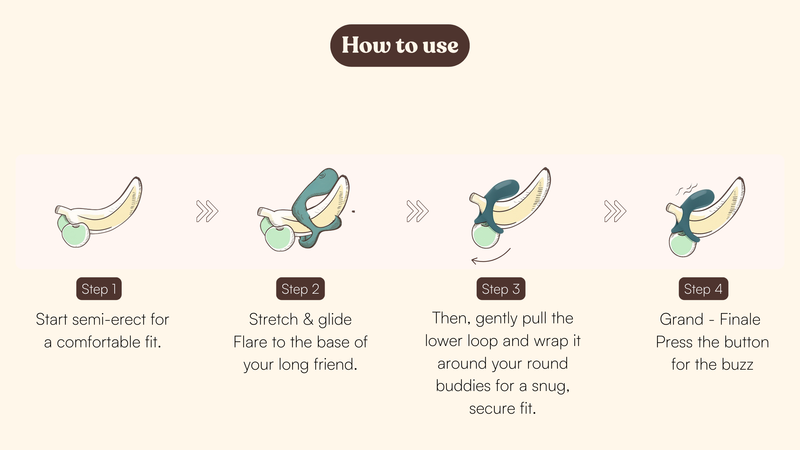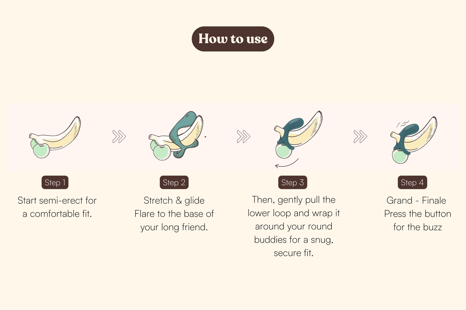 - Stretch & Glide:Stretch the top ring and slide Halo down the shaft. Keep the larger vibrating head facing forward.